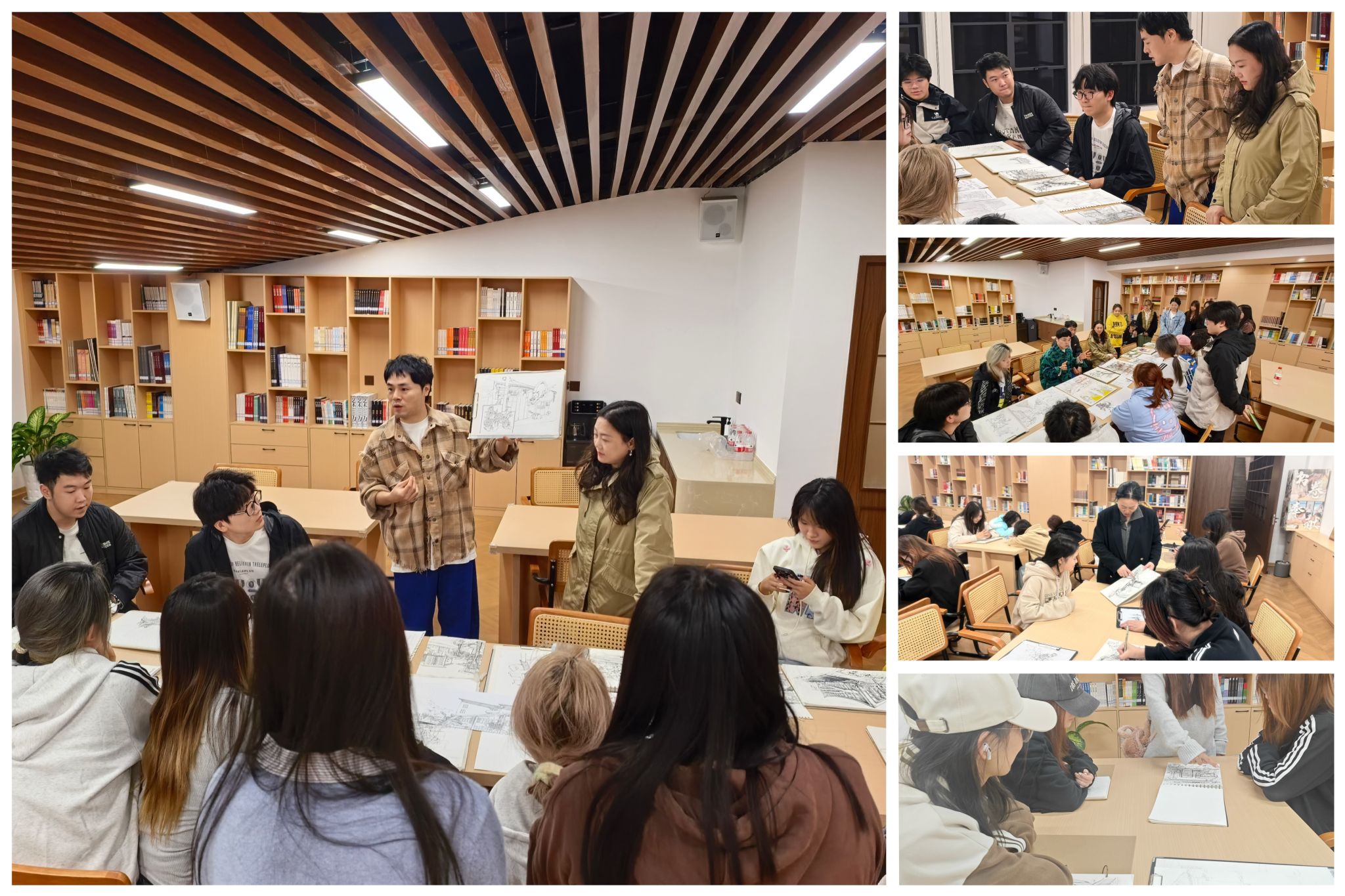 在为期五天的实践教学中,学生们沿着青石板路深入探访古镇的各个文化节点,开展系统性的写生训练与田野调查。在书院街,同学们细致描摹传统木构建筑的构造细节与装饰特色;在麻乡约民信局旧址,深入了解古代邮驿制度的运作机制与文化内涵;在南华宫、万天宫等宗教建筑中,用心感悟传统建筑的空间布局与意境营造;在绵延的盐马古道上,切身体会历史上商贸往来的繁荣景象;在参观王良将军纪念馆时,深刻学习革命先辈的英勇事迹与红色精神。每晚,师生们都会集中进行素材整理和创作研讨,形成了“日间采风—晚间整理—即时点评—反复打磨”的完整教学闭环。