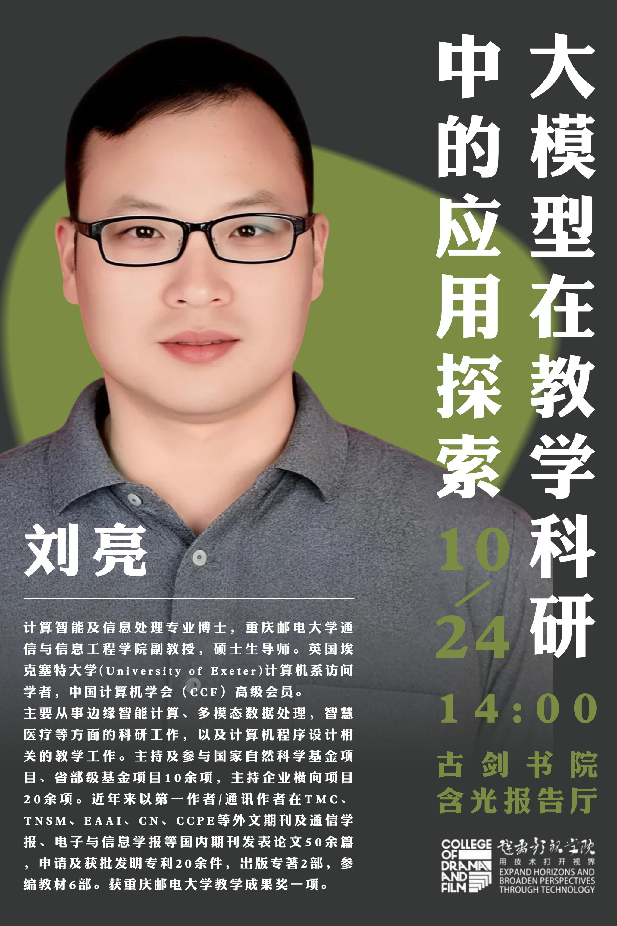 为深入贯彻学校“以科技创新赋能教育高质量发展”的目标,全面提升戏剧影视学院教师的科研创新能力与信息化教学水平,促进AI大模型在教学科研领域的深度融合。10月24日下午14:00,戏剧影视学院于古剑书院含光报告厅举办了主题为《大模型在教学科研中的应用探索》的专题讲座。本次讲座特邀重庆邮电大学通信与信息工程学院副教授、硕士生导师刘亮博士主讲,学院领导、教师代表及全体入职未满一年的新教师参加了此次活动。