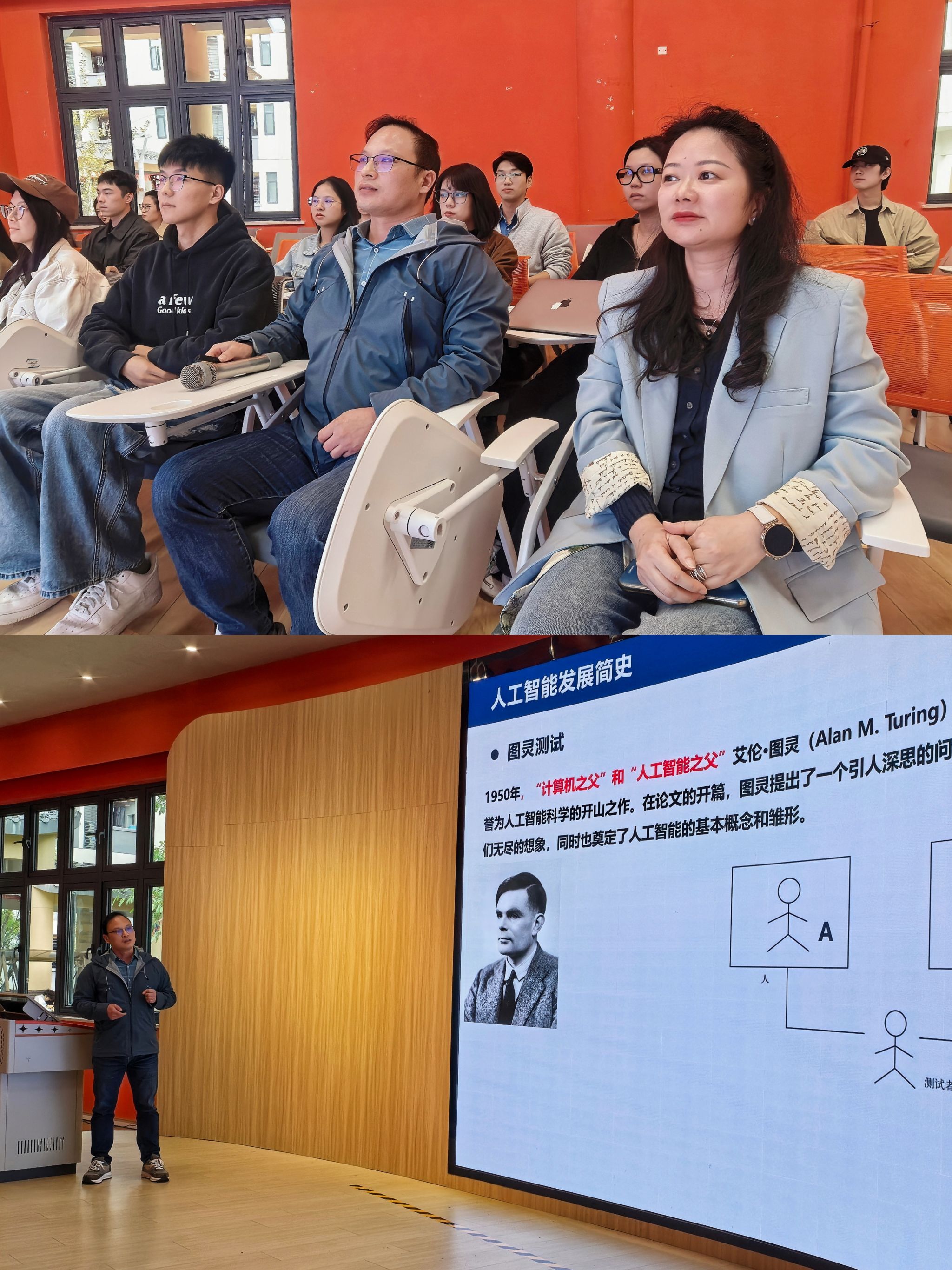 讲座中,刘亮副教授以通俗易懂的方式为教师们梳理了人工智能的发展脉络,从早期的符号主义到深度学习时代的神经网络模型,再到当下快速演进的大模型技术,系统阐释了人工智能的理论基础与演变趋势。他结合丰富的教学与科研案例,深入讲解了神经网络的运行机制与核心原理,并展示了多种主流AI模型的功能特点及其在科研中的应用方式。讲座现场,刘亮副教授还通过演示多种AI指令的具体用法,帮助教师们直观理解人工智能如何赋能教学设计、论文写作、数据分析与学术创新。通过生动的案例与互动环节,参会教师们不仅了解了人工智能技术的核心逻辑,也感受到大模型在教育领域的现实潜力与未来方向。