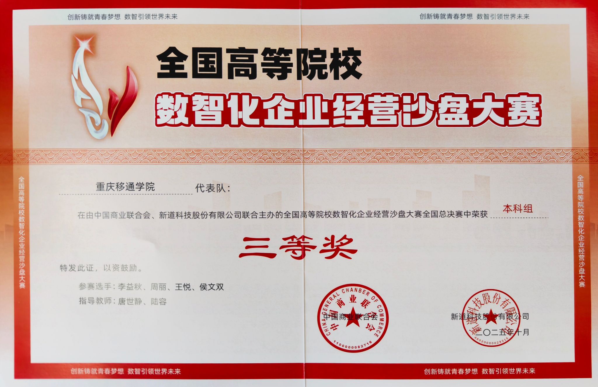 10月17-19日,2025全国高等院校数智化企业经营沙盘大赛(本科组)全国总决赛在南京航空航天大学金城学院举办。我校财务管理专业建设负责人唐世静老师带领4位财务管理专业学生积极备赛,在117只队伍的激烈竞争中脱颖而出,荣获全国三等奖。