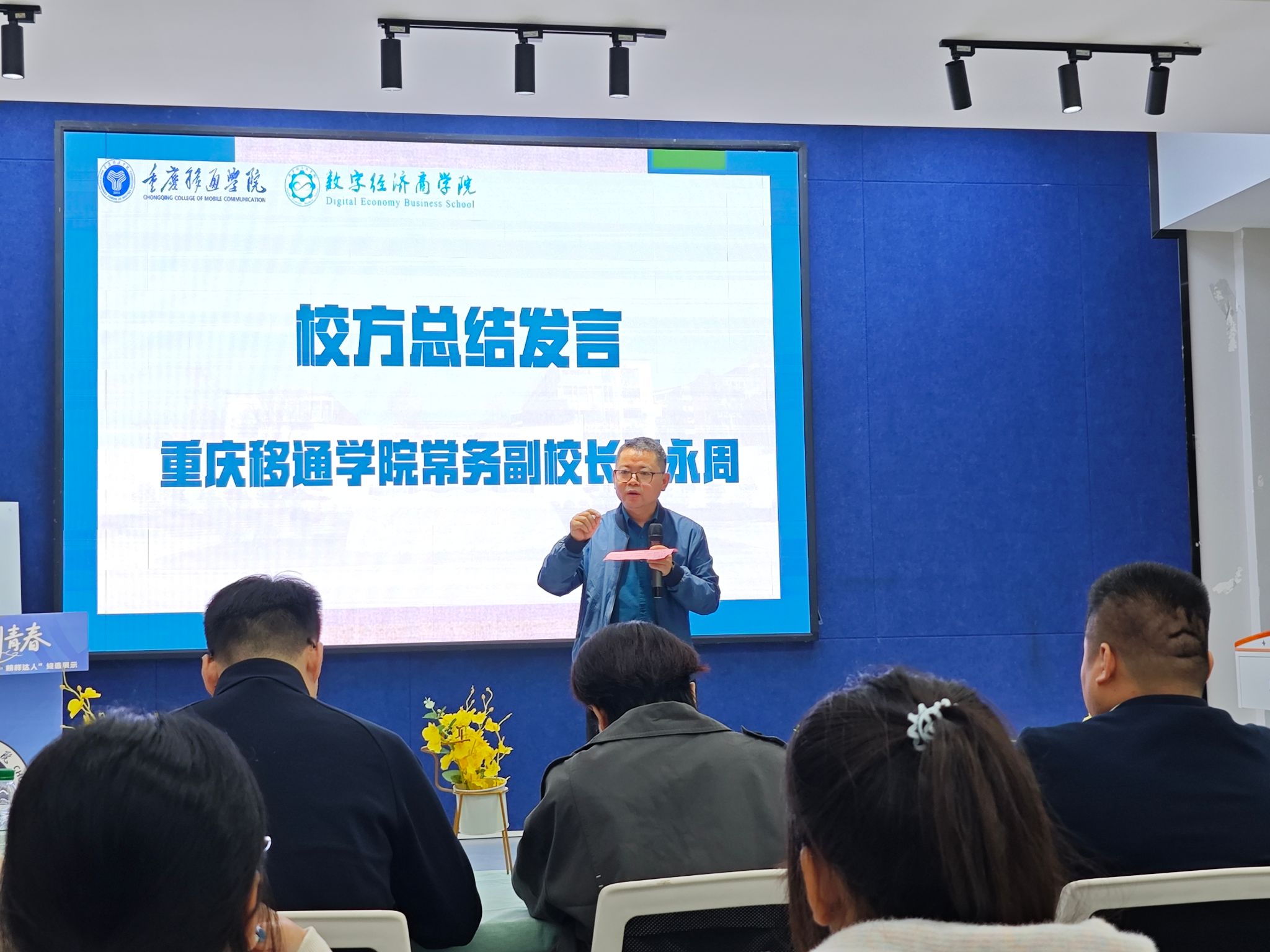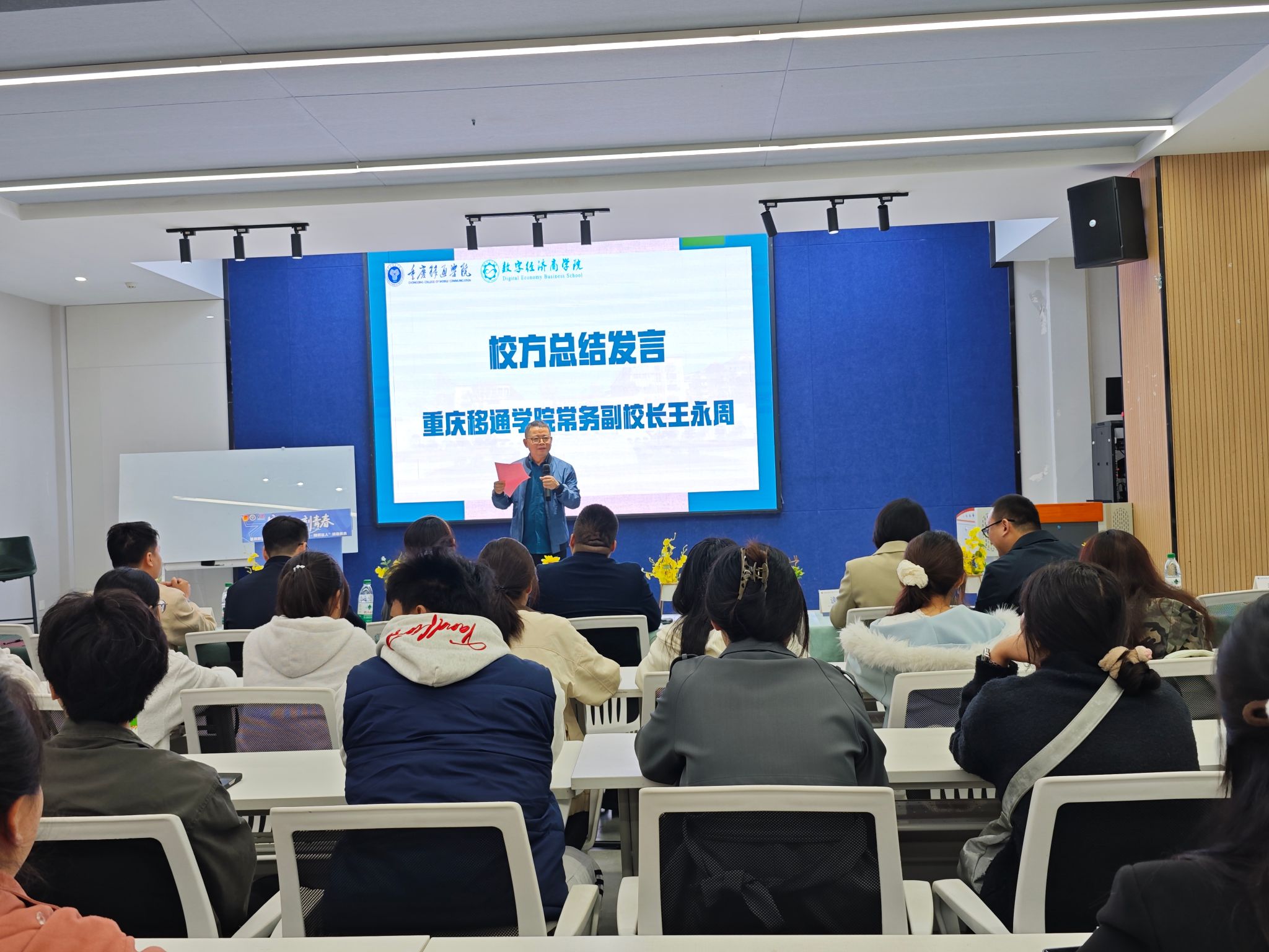 王永周常务副校长总结发言,他肯定了数智运营产业学院在产教融合领域的探索成果,寄语人才班同学要珍惜校企合作的优质资源,在数智化浪潮中锤炼技能、勇担使命,成长为推动产业发展的中坚力量。