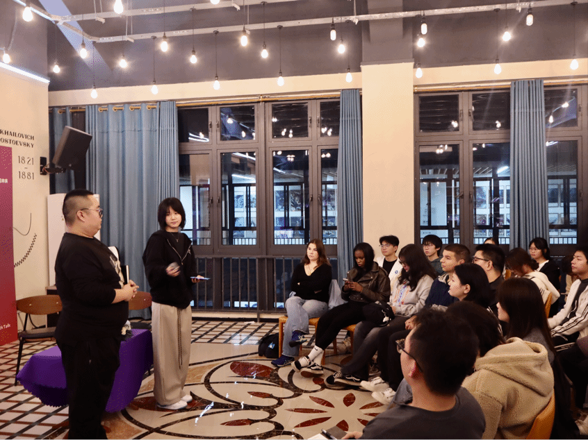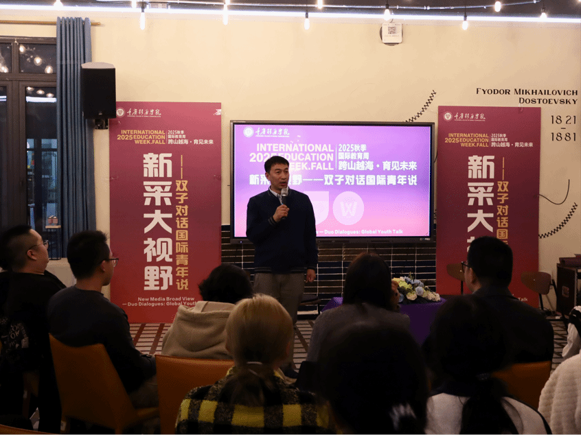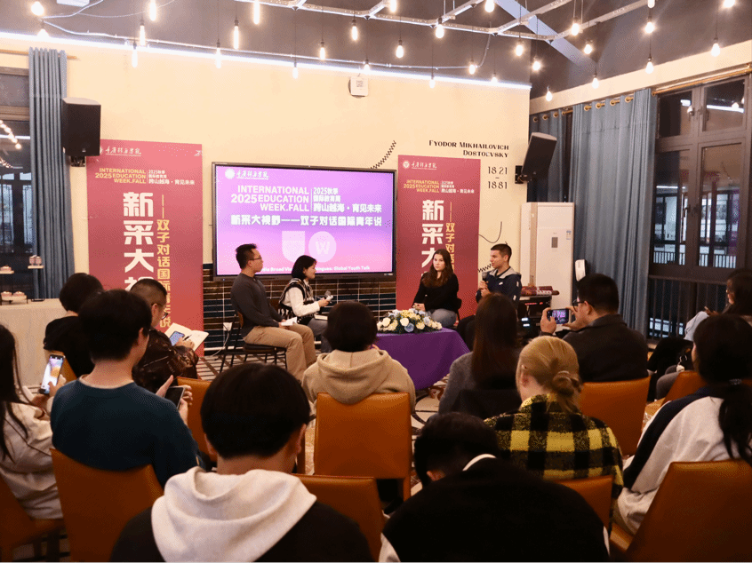 10月29日,重庆移通学院合川校区天空书院陀思妥耶夫斯基书店内座无虚席,一场以“双子对话国际青年说”为主题的国际交流活动在此举行。来自德国的四名留学生与国际教育学院、新闻采写产业学院的四名中国学生代表展开深度对话,共同探讨教学体验、文化差异与校园生活等话题。