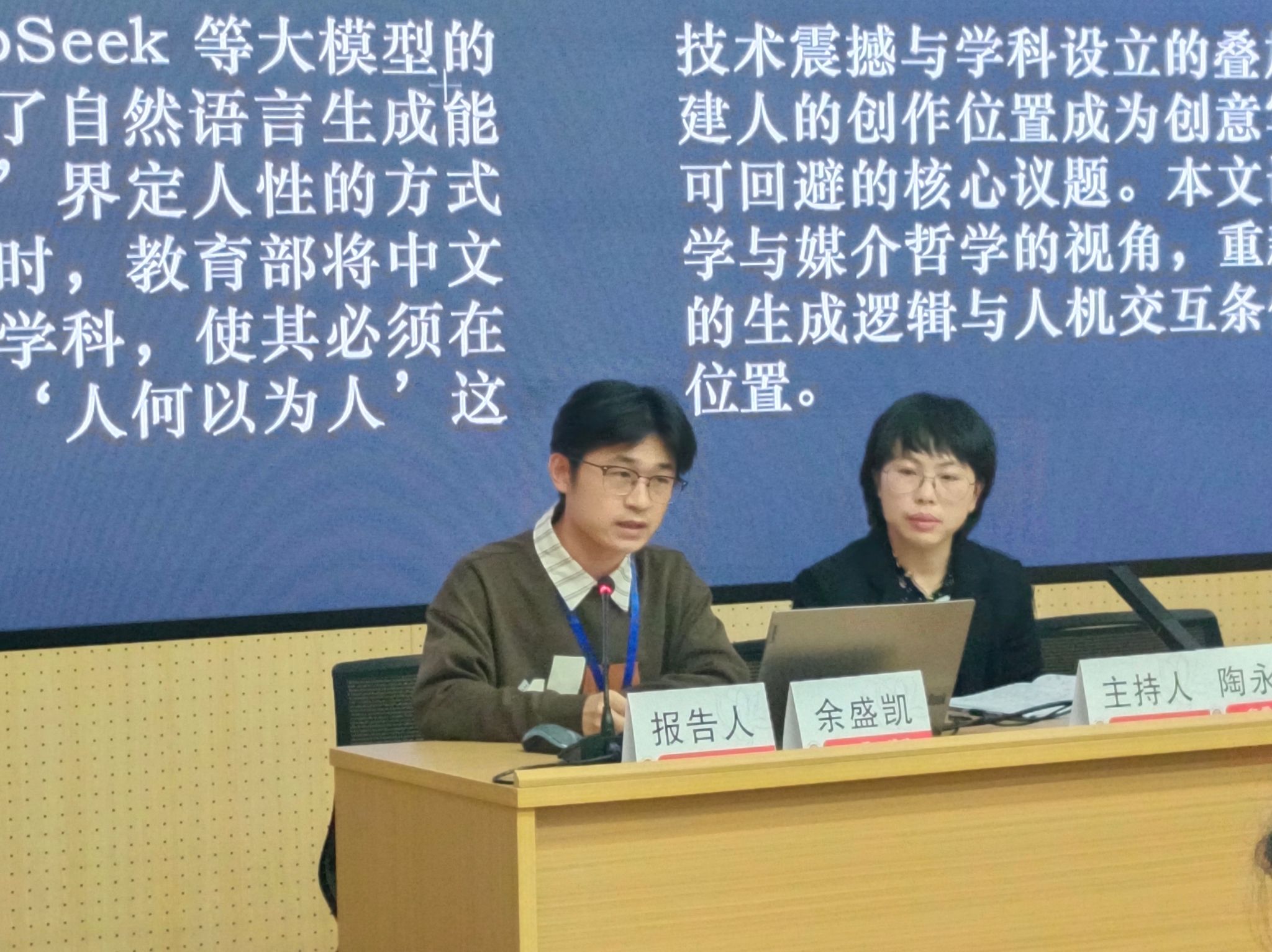 余盛凯老师在 “中文创意写作学科建设与自主知识体系建构” 分论坛,以《从书写到界面:数智时代中文创意写作发生问题研究》为题发言。他从现象学视阈审视该学科发生问题,借后人类理论梳理知识语境及论证危机,引入弗卢塞尔技术图像理论,分析传统书写离散为粒子维度的转型,将其视为 “凝想” 动态过程,且创意重构为具身 “姿势”,提供抵抗熵化的价值维度。其试图阐明 AI 时代创意写作借凝思姿势成为人文抵抗的关键路径,为学科建设提供伦理展望。