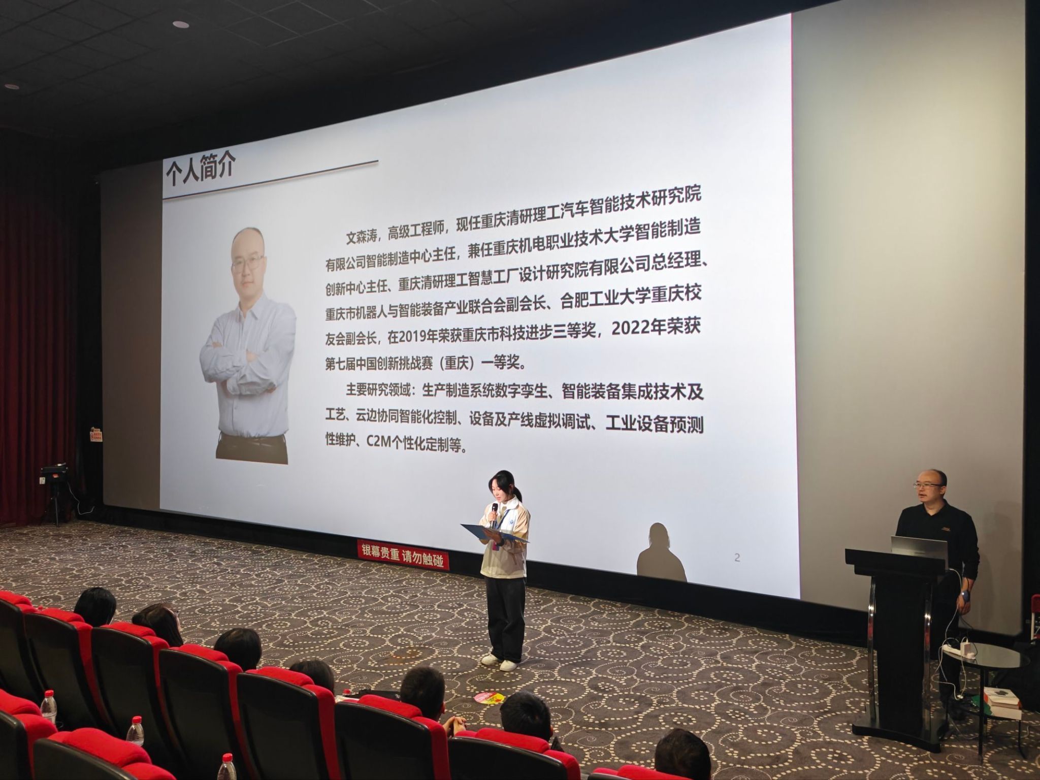 智能工程学院于10月31日下午14:30在万画影城4号教学厅成功举办对话“智”造者系列讲座第41期。本次活动特邀重庆清研理工智慧工厂设计研究院有限公司总经理、重庆清研理工汽车智能技术研究院有限公司智能制造中心主任,重庆市机器人与智能装备产业联合会副会长,重庆市机器人学会理事,合肥工业大学重庆校友会副会长文森涛老师主讲。智能工程学院党晓圆院长、智能制造教研室、智能装备教研室教师代表与200余名学生齐聚现场,聆听前沿分享、积极互动交流,学术氛围浓厚。