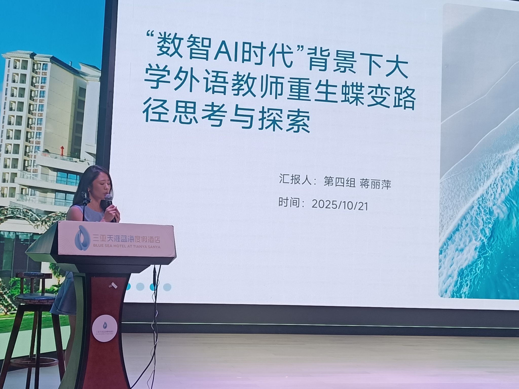 第四组汇报人蒋丽萍聚焦“数智 AI 时代大学外语教师重生蝶变”,提出 “补丁升级-职业重塑-育人升级”三步路径,构建“教师 + 学生 + AI” 三元育人模式;最终目标是完成从“单一语言工作者”到“跨文化教育者”的转变。