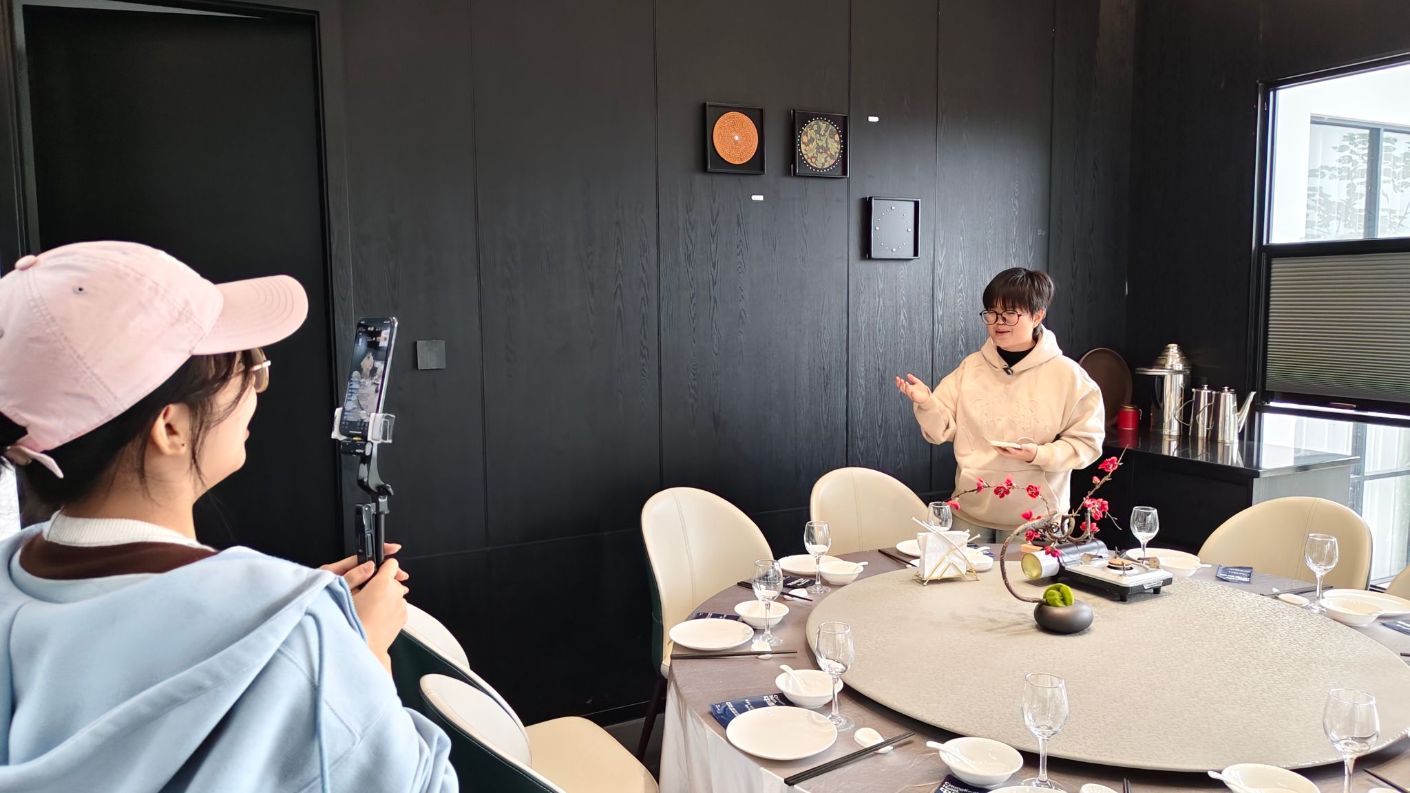 实习期间,企业负责人根据学生的专业特长完成精准分组,实现岗位任务与专业能力培养的深度结合:2名同学组成广告设计组,负责两家门店宣传物料设计,锻炼品牌视觉设计、商业需求解读及与门店的需求对接和方案优化能力;5名同学加入短视频运营组,主攻中港饭店美食内容策划与流量变现,从拆解本地美食爆款视频逻辑入手,结合重庆食客消费偏好策划选题,通过拍摄突出菜品与用餐氛围、剪辑嵌入引流,深化短视频选题策划、场景化内容创作能力与商业内容运营思维;另有5名同学作为主播承担该企业的带货工作,,在实时互动答疑与应对突发问题中,锻炼产品专业讲解、临场应变及销售导向的直播控场与互动引导能力。实习过程中企业从市场需求出发对学生的作品进行讲解评价、让学生在理论知识和基础技能有效融合的基础上更加贴合行业需求,为后续的工作打下坚实基础。