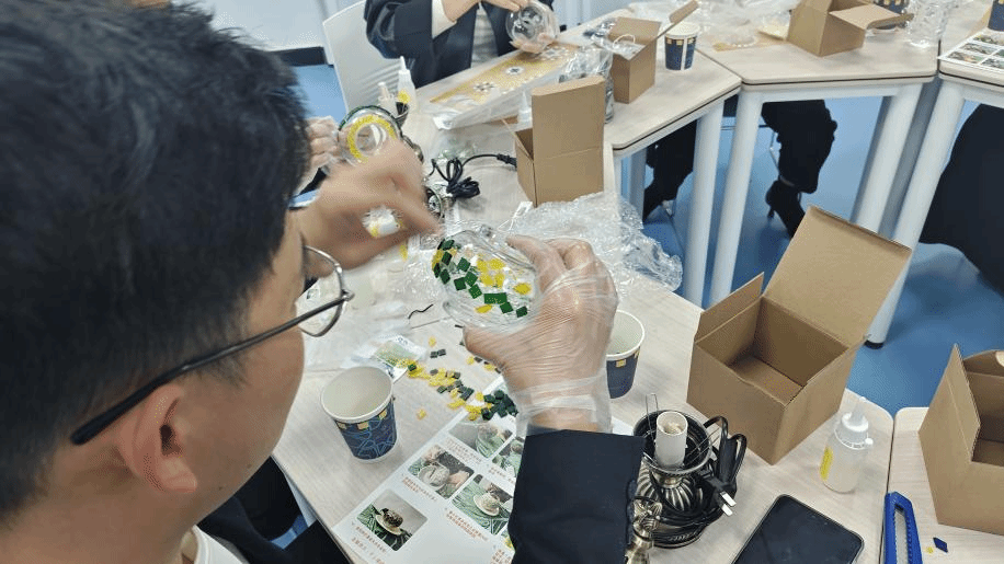 琉璃灯区宛如梦幻之境。老师们搭配琉璃片、固定修饰,制作出精美小夜灯。创作中,大家交流互助,温馨氛围弥漫。