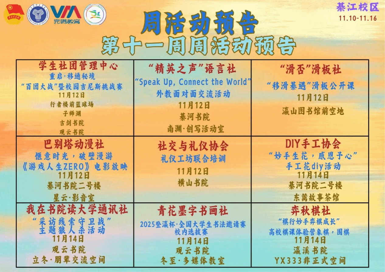 社团活力不打烊,超多惊喜已上线!第十一周,盼与每一位同学温暖相逢,共赴鲜活的青春社团之约,解锁无限欢乐!