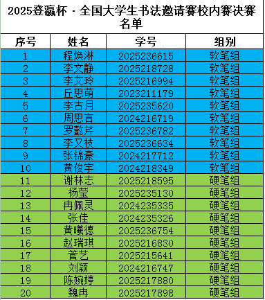 校内书法指导老师与社团负责人、社团核心成员等组成的评审团对提交的参赛作品,依据笔法、结构、章法及创新性等标准,认真筛选、反复比较,最终各选出10名毛笔书法与硬笔书法选手进入线下复赛。