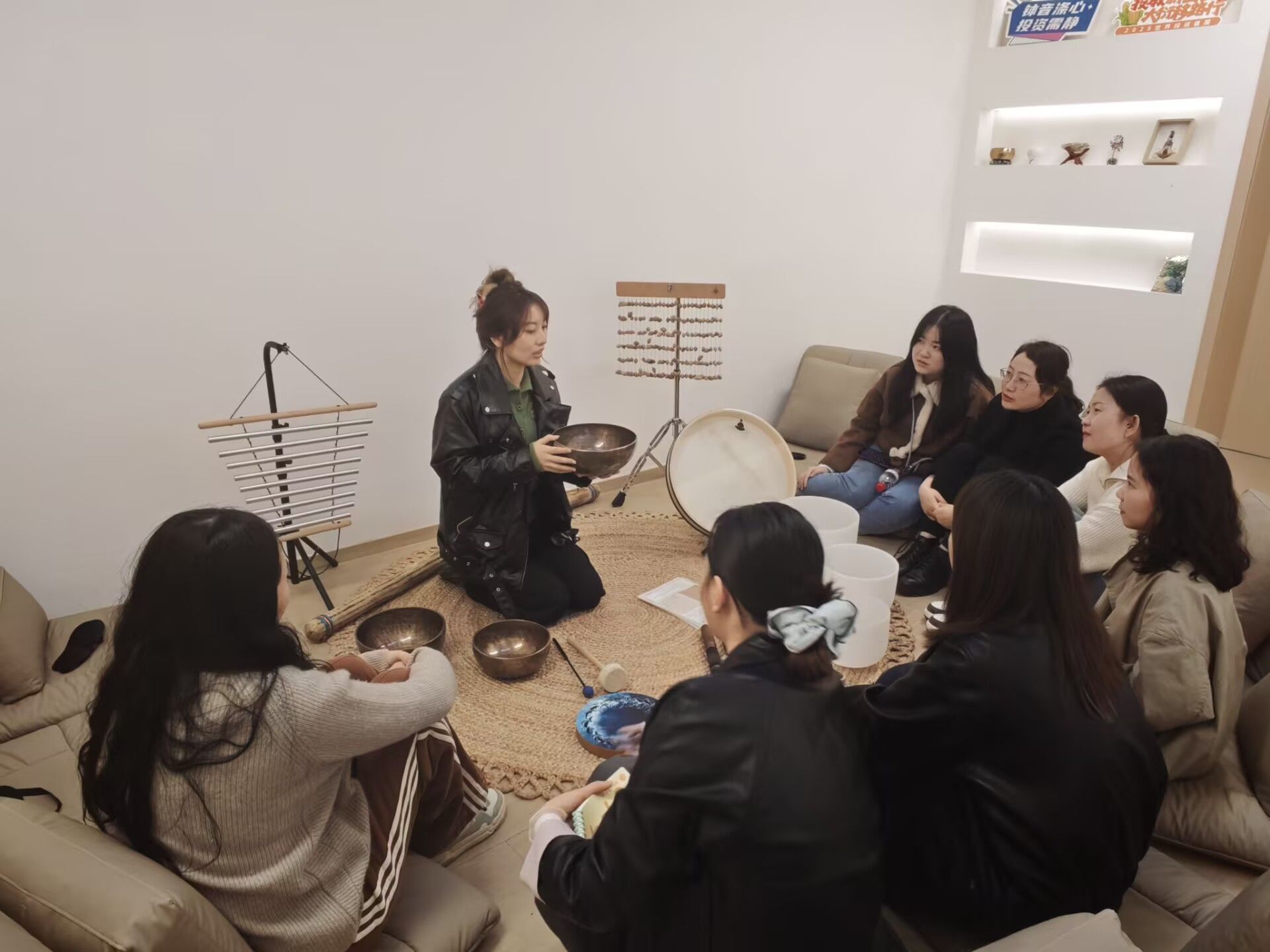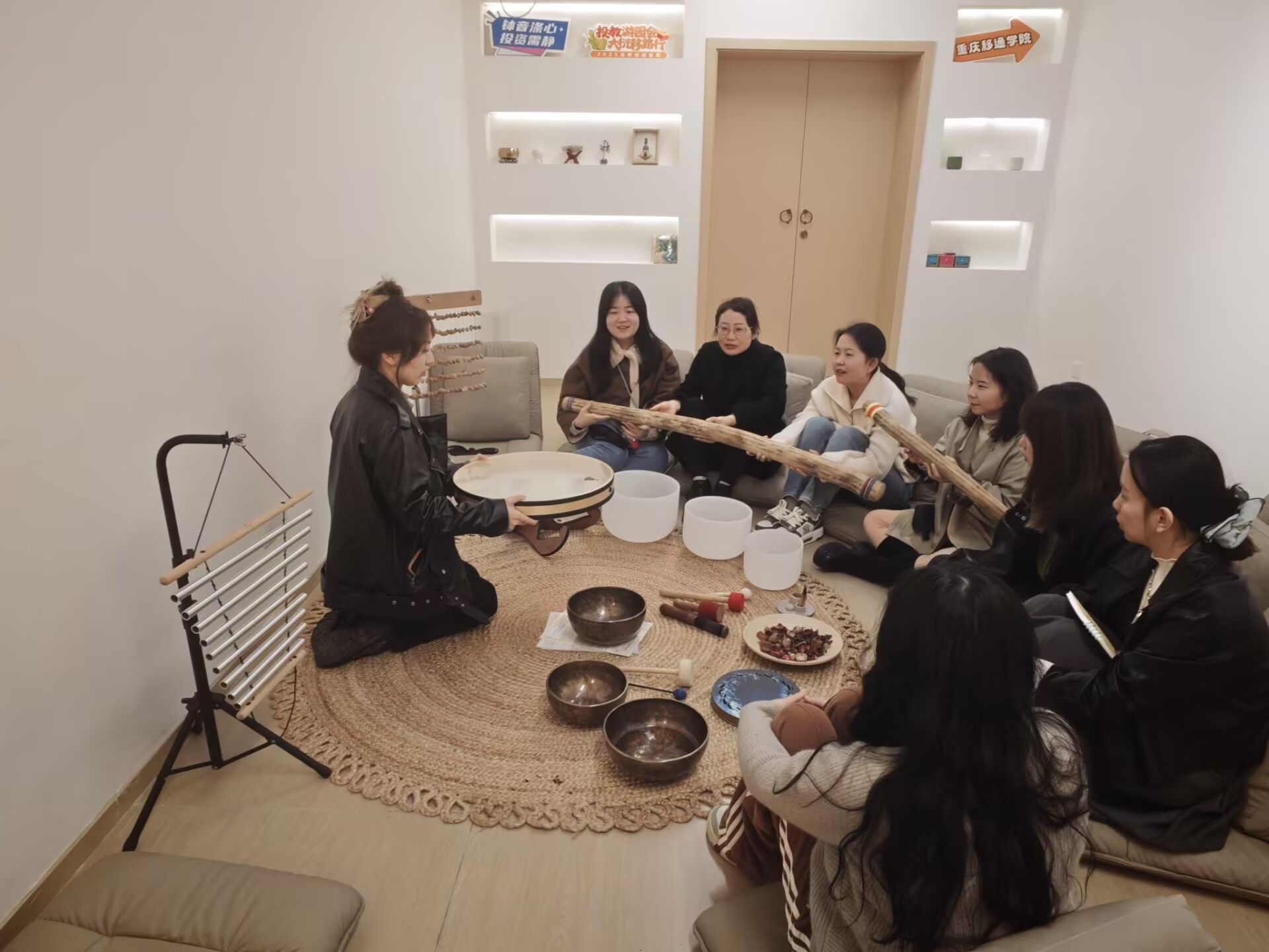 在鱼铖书院赵晨老师的引领下,部分异科导师体验了“颂钵疗愈”,空灵深远的钵音为老师们提供了一次难得的深度放松与压力释放,大家通过亲身感受声音疗愈的魅力,学习了一种可供借鉴的心理调适方法,也为日后将更多元化的心理疏导方式融入异科工作积累了经验。