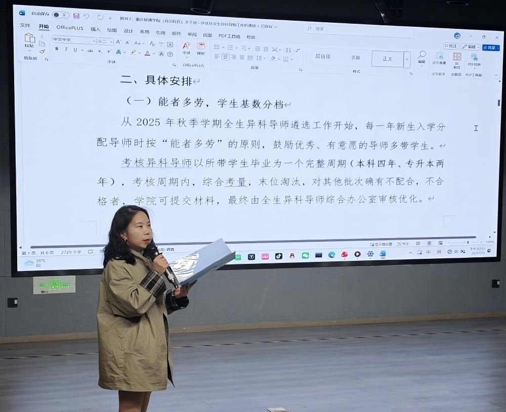 培训最后,通信与信息工程学院王艺老师就《重庆移通学院(合川校区)关于进一步优化全生异科导制工作的通知》《重庆移通学院通信与信息工程学院全生异科导师工作考核指标体系》进行了详细解读。明确本学年工作考核要点、支持机制与导向,强调考核的激励赋能作用。现场异科导师踊跃提问,互动讨论热烈,相关困惑逐一得到解答。