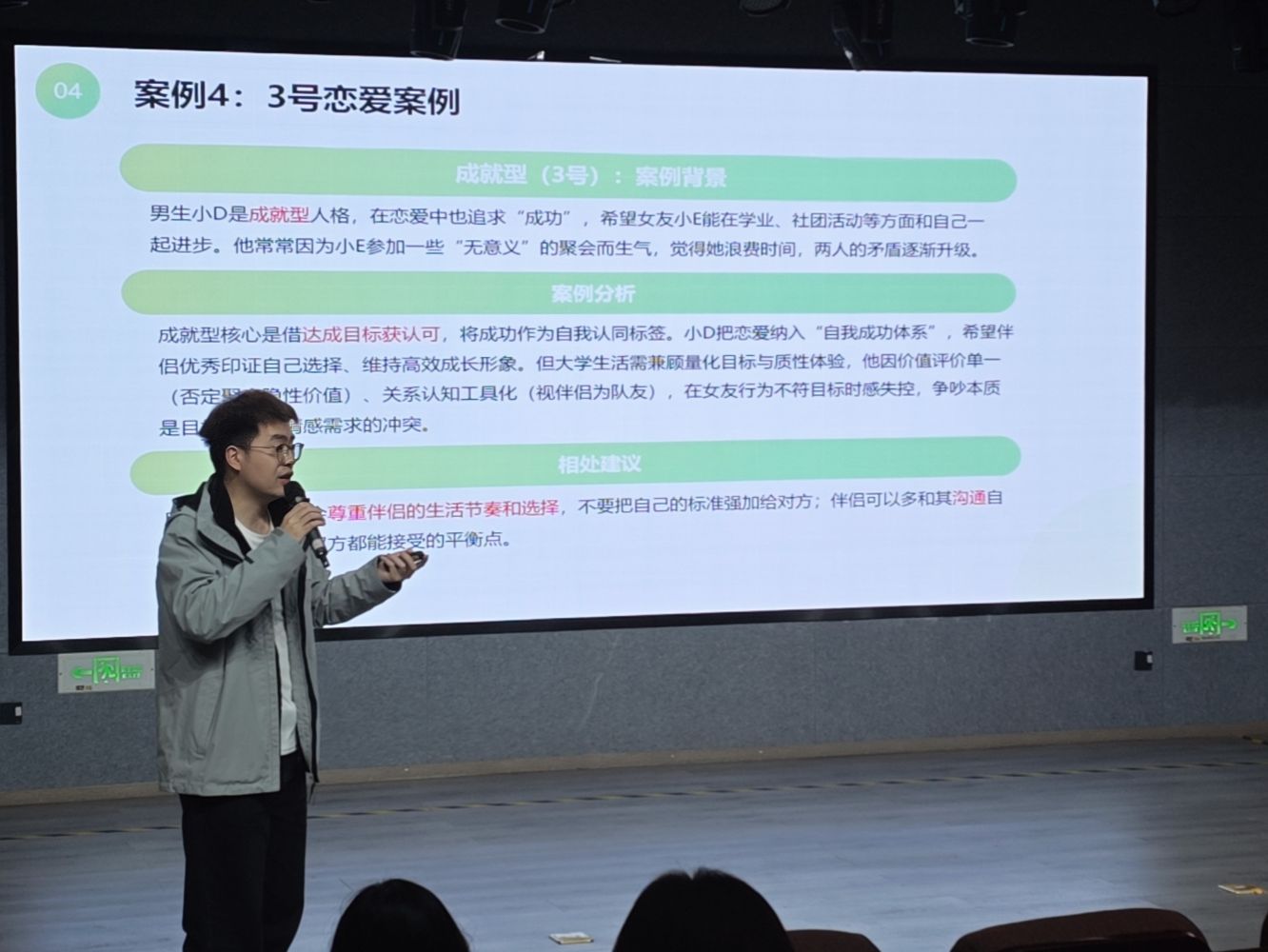 通信与信息工程学院心理专项岗陈颖老师以《恋爱中的九型人格》为主题,从人格心理学视角,结合青少年情感发展特点与真实学生案例,深入浅出拆解九种人格类型。同时,他剖析了不同人格学生在情感关系中的核心需求、潜在恐惧与沟通偏好,针对不同人格组合的互动模式给出观察技巧与沟通建议,助力导师精准定位学生情感困扰根源。