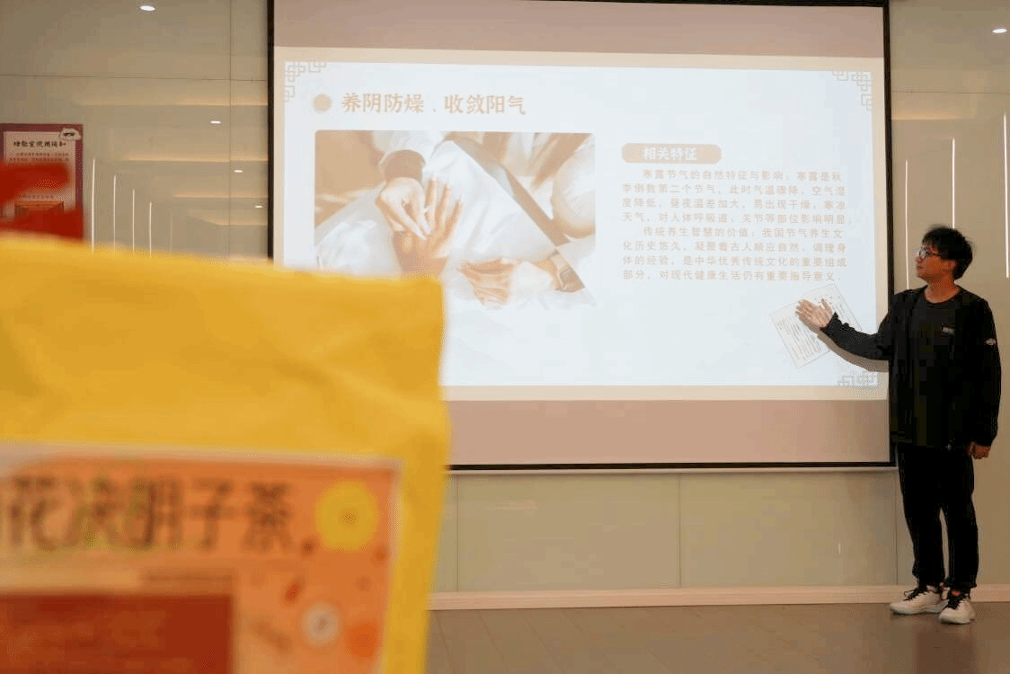 活动伊始,养生协会社长李瑛杰以《月令七十二候集解》为引,介绍寒露三候——“鸿雁来宾、雀入大水为蛤、菊有黄华”,指出“燥邪伤肺、寒邪伤脾”是深秋常见病机。据统计,每年10月下旬因秋燥就诊人数较平日增长27%,借此数据,他详细解析芝麻、柿子、冬枣三种寒露传统食材的营养成分与功效,将民间习俗与现代营养学对照,为同学们提供了一份“吃得懂”的寒露食谱。