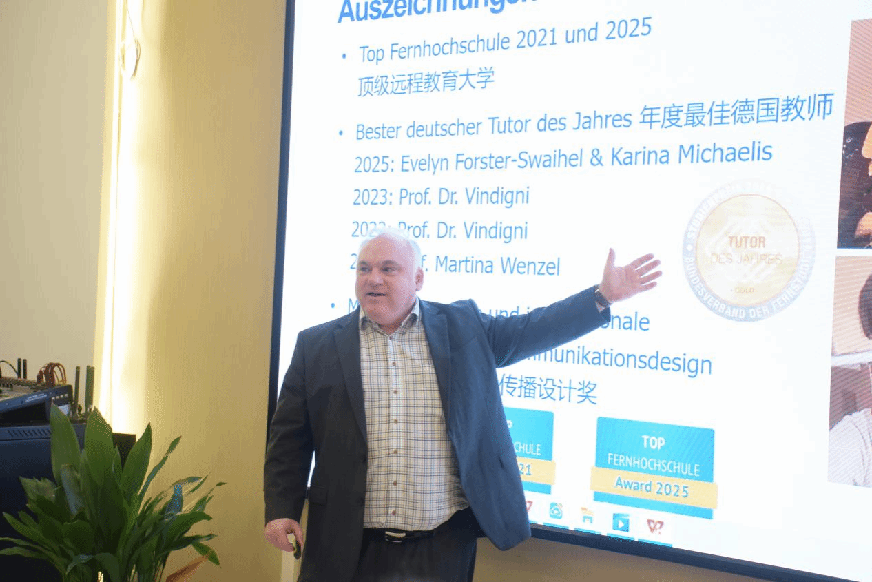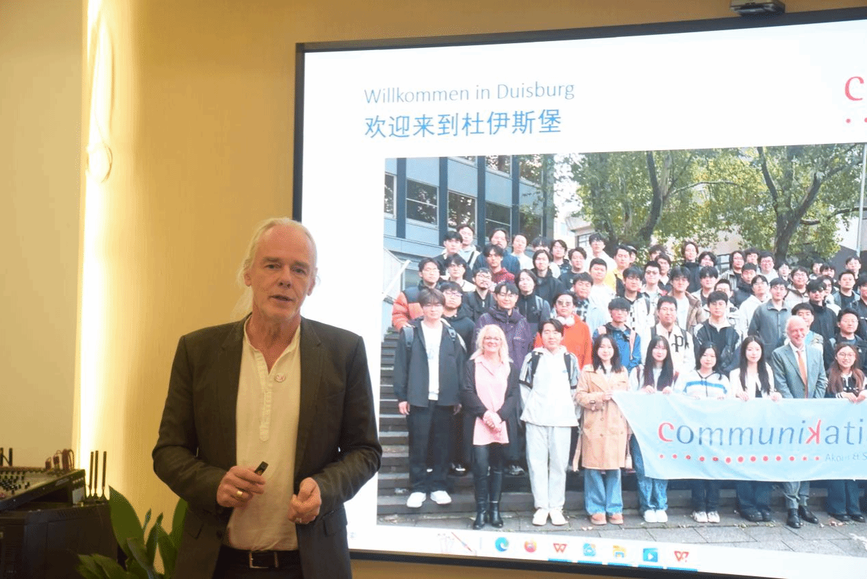 杜伊斯堡语言学校校长Dr. Dirk Scholten就学生在德的语言学习情况进行了介绍。他强调了语言作为专业学习与职业发展的基石作用,并分享了提升语言能力的有效策略。Scholten校长表示,通过系统的语言强化训练,中国学生能够顺利适应德国的学习环境,取得优异成绩。