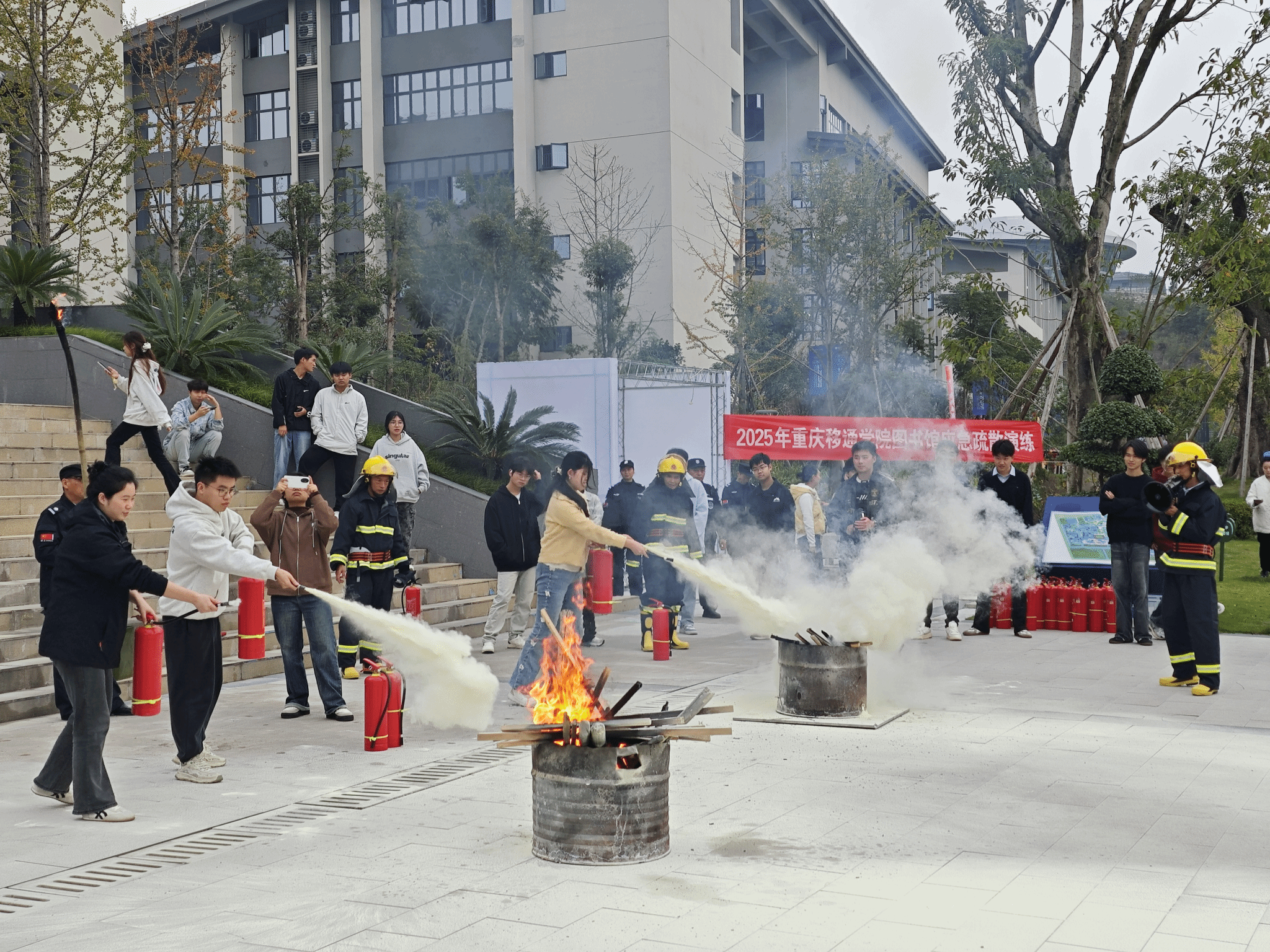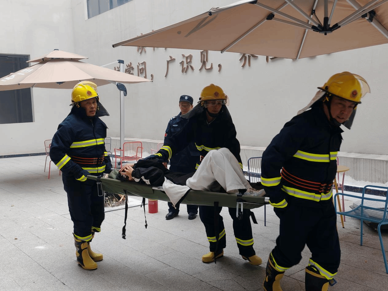 演练模拟图书馆三楼突发“火情”,烟雾弥漫,警报响起。各工作组迅速响应,疏散引导组组织师生低姿捂口鼻有序撤离;灭火救援组展开扑救与人员搜救;医疗、后勤、警戒等小组密切配合。整个过程紧张有序,全员安全撤离至指定区域。