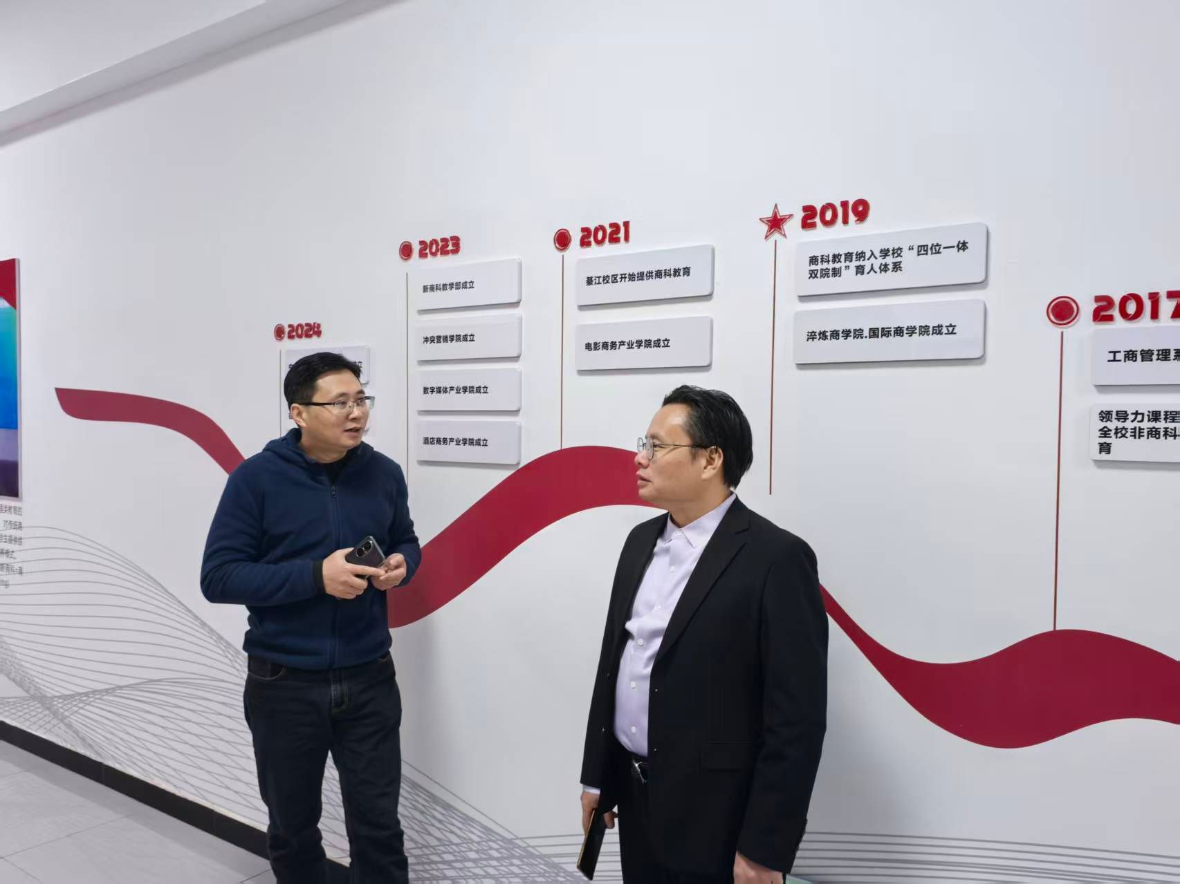 重庆市中小企业发展促进会于德明副会长前往参观了我校远景学院、爱莲书院、商科教育成果展示地等,于德明副会长对我校书院建设和商科教育成果表示高度赞扬。