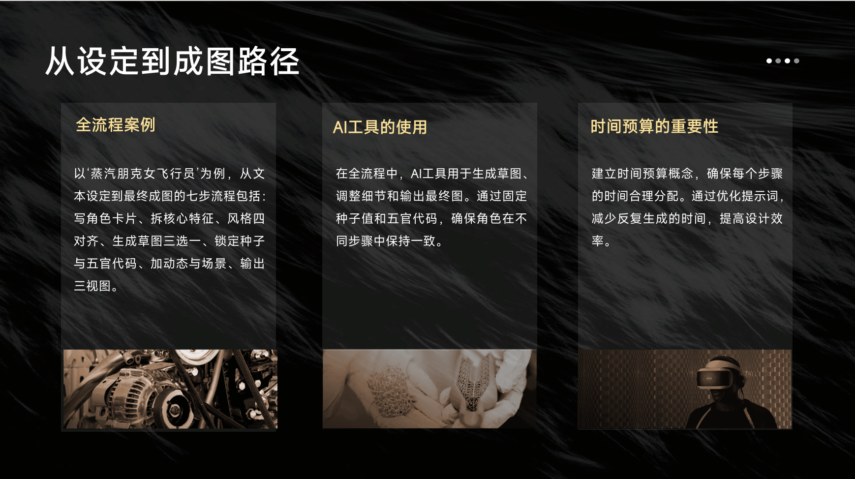 次日上午,编剧导师安宕宕引入“三幕剧结构”与ChatGPT剧本生成技术,指导教师创作团队利用AI工具拓展世界观设定与角色小传。下午课程转向动态分镜制作,通过Runway/Kling图生视频功能实现静态画面动态化,并完成音画同步初剪。各小组根据当天所学内容,撰写了详细的剧本大纲和人物小传,并生成了细致的人物设定图。