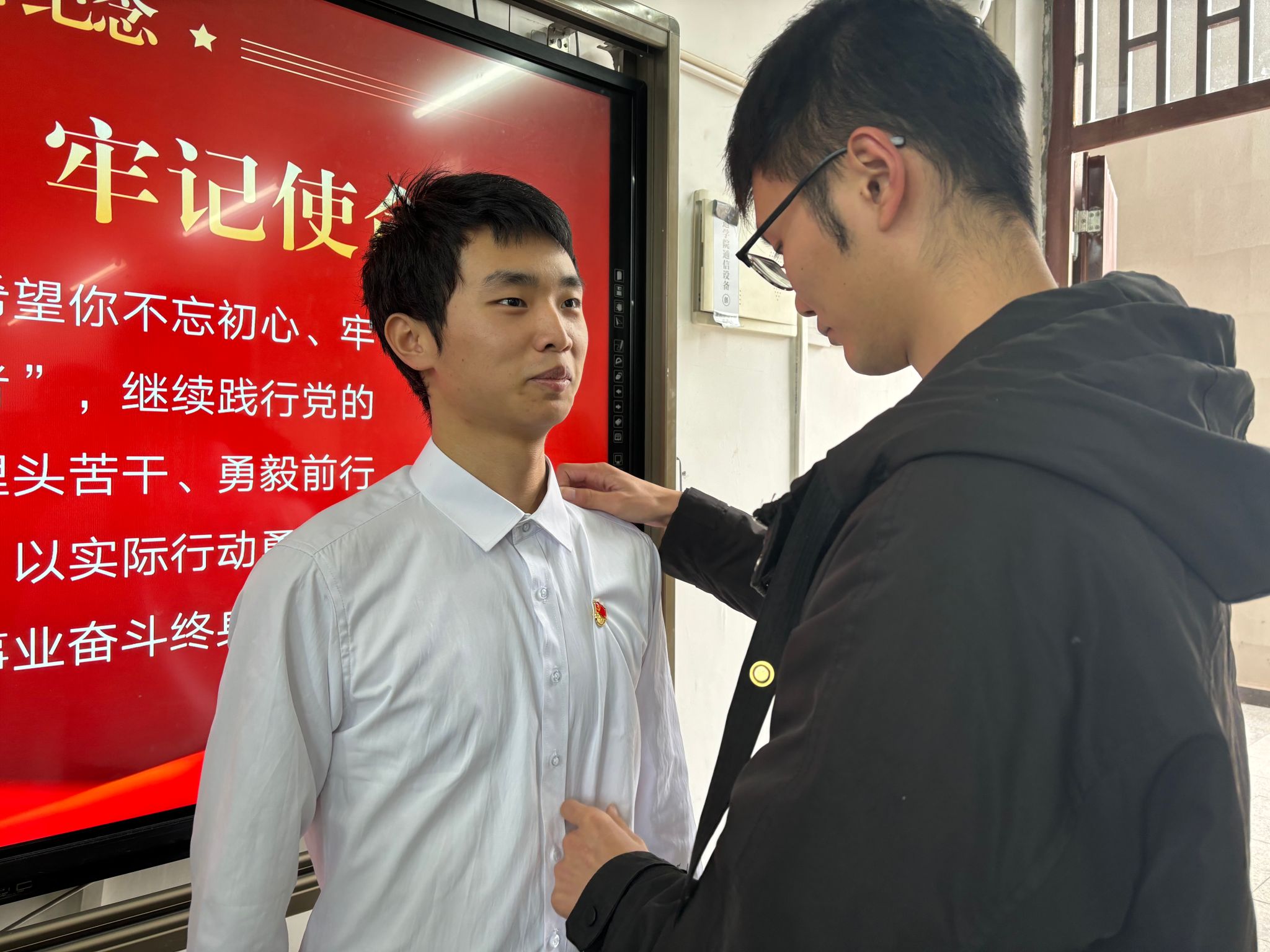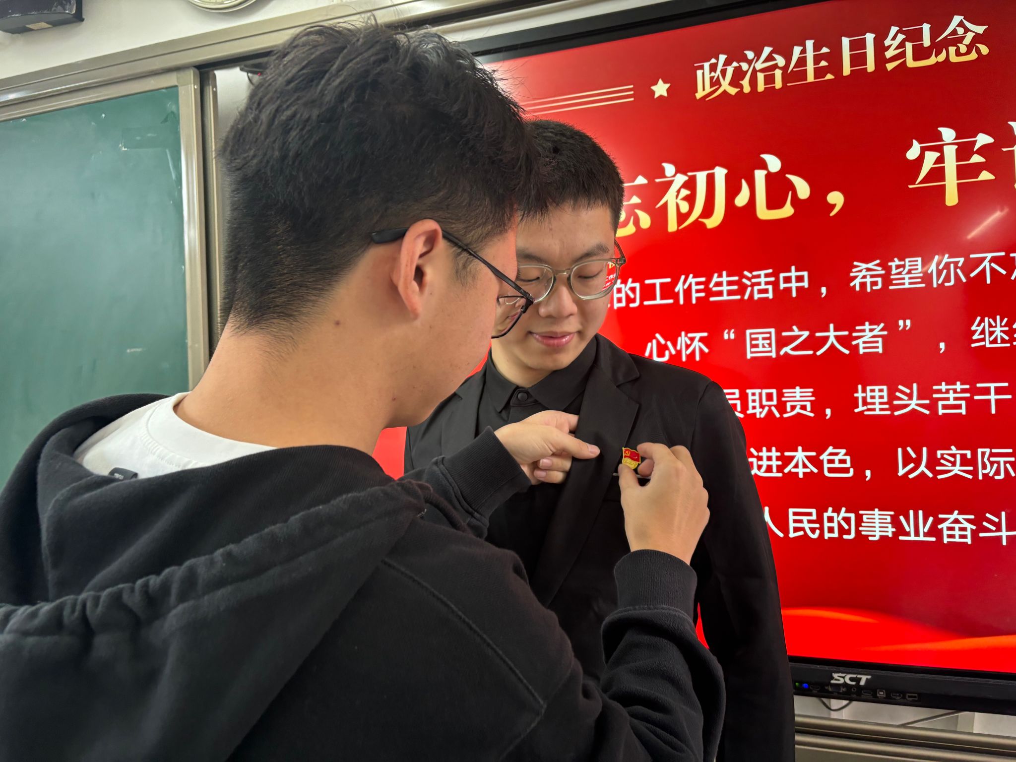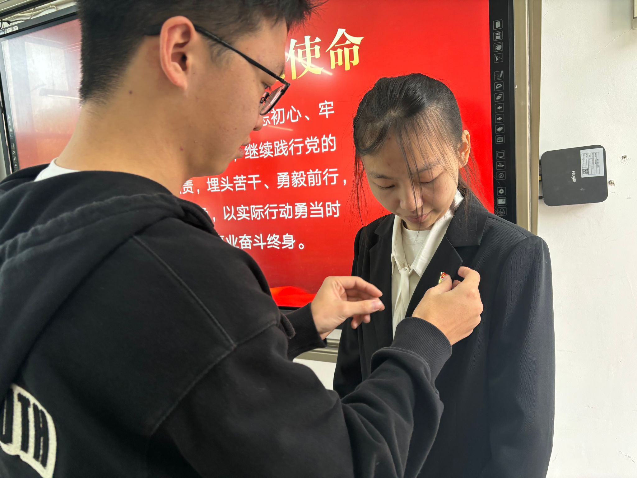 接着,由刘博涛同志为三位同学佩戴了党员徽章。“今天的宣誓不是终点,而是新的起点。”谭英姿书记在总结讲话中强调,“希望同志们把誓词刻进心里、融入日常——在课堂上做求知的先锋,在集体中做奉献的标杆,在挑战前做担当的榜样,用行动证明共产党员不仅是身份,更是责任。”