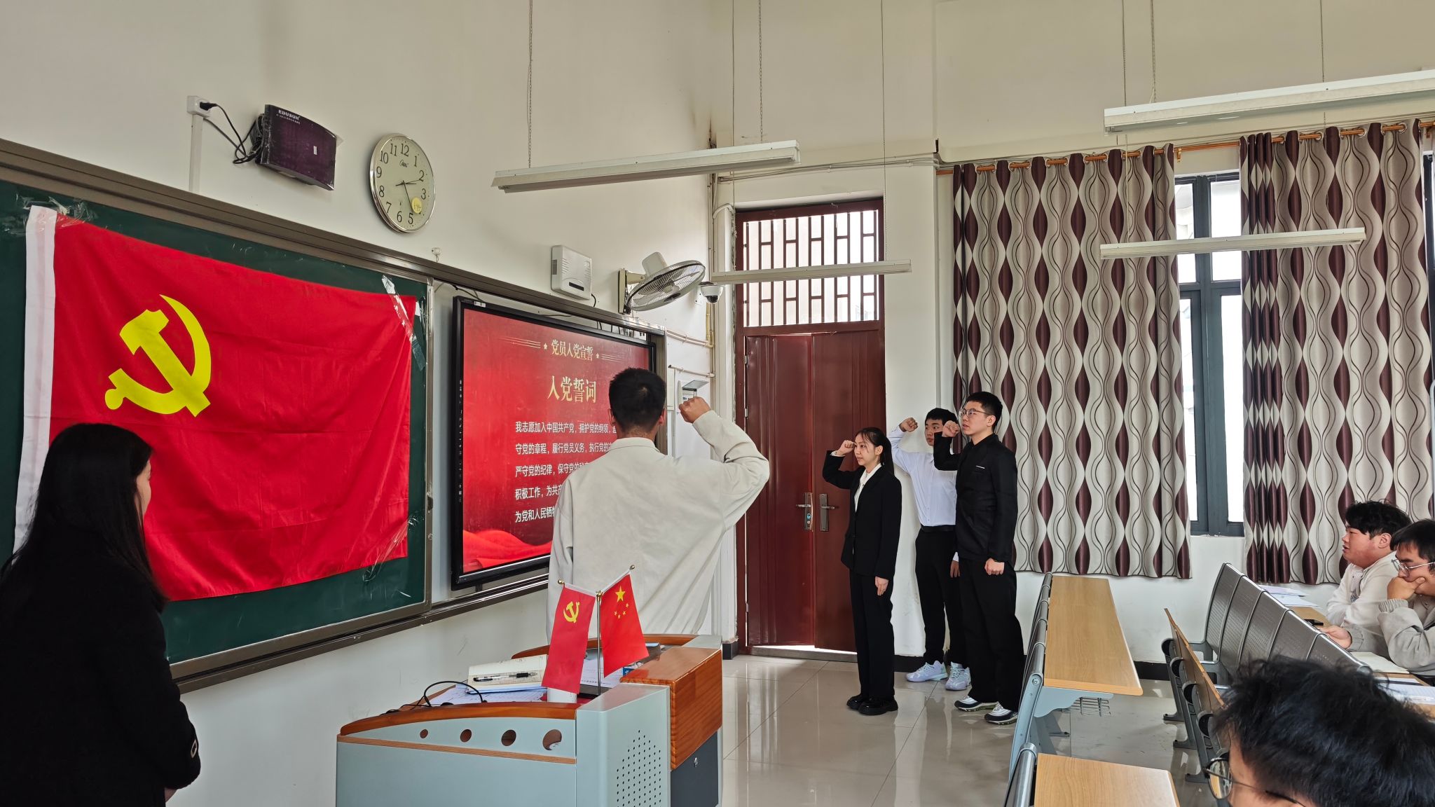 “我志愿加入中国共产党……”在鲜红的党旗下,由黄俊翔同志领誓,三位同志高举右拳,庄严宣誓。誓词字字千钧,目光灼灼如炬,稚嫩却坚定的声音在会议室回荡,彰显着青年党员“请党放心,强国有我”的决心。