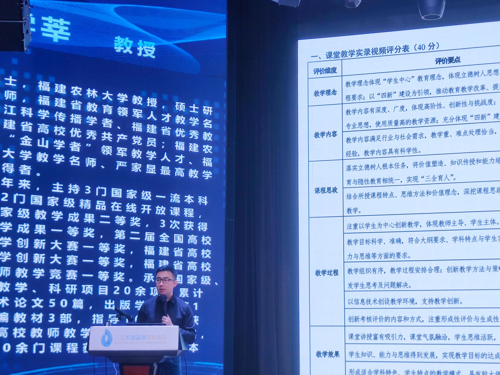 11月21日上午,福建农林大学教授刘学莘带来了“以赛促教,助力青年教师教学能力提升”专题讲座。刘教授通过展示和解读历年青教赛比赛案例视频,进一步帮助参会老师们加强对青教赛评分标准、赛制以及比赛要点等各方面的认识。此外针对教学创新大赛,刘教授提出授课教师应该结合学科特点定制专属教学模式,实现教学模式创新。