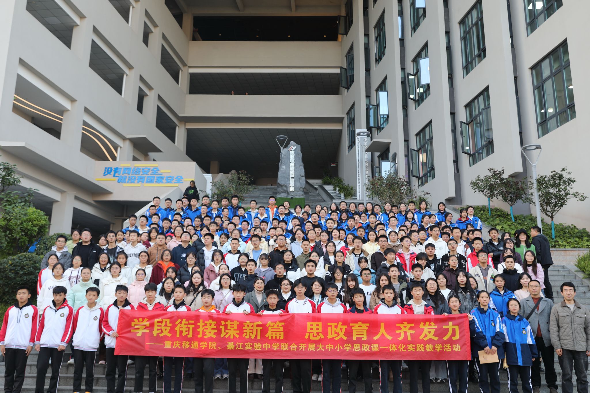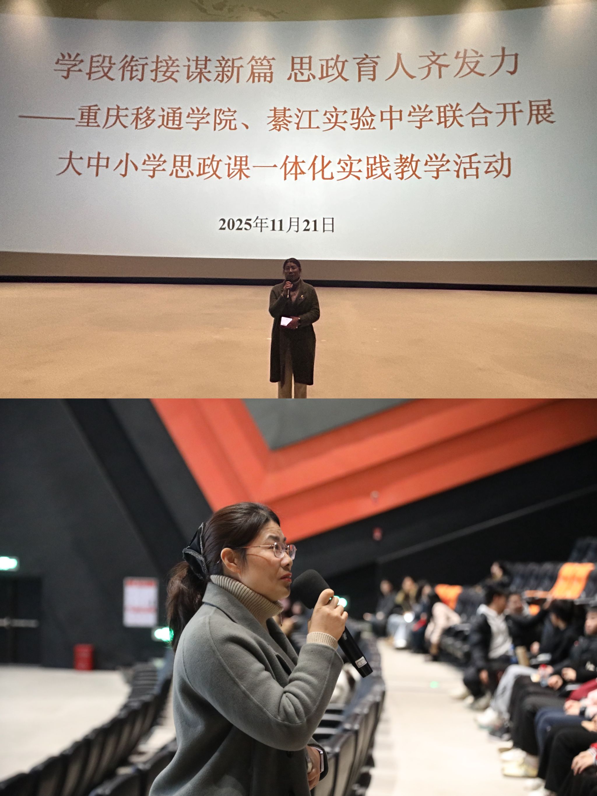 为进一步深化大中小学思政课一体化建设,2025年11月21日,重庆移通学院联合重庆市綦江实验中学在万画影城举办实践教学活动。活动由郝月霜老师主持,两校师生代表300余人参与。