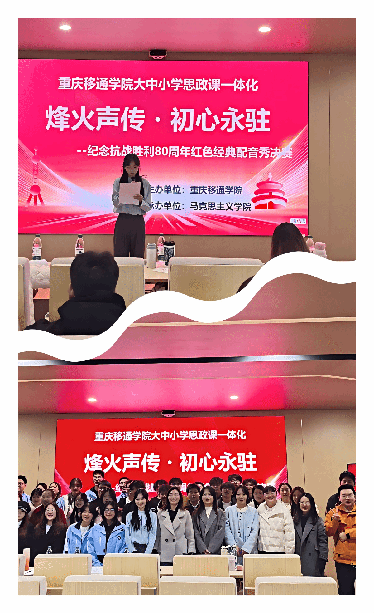 为纪念中国人民抗日战争暨世界反法西斯战争胜利80周年,落实习近平总书记对学校思政课建设的重要指示精神,11月19日下午,重庆移通学院大中小学思政课一体化建设暨“烽火声传・初心永驻——纪念抗战胜利80周年红色经典配音秀”决赛在天空书院305圆满落幕。本次活动由马克思主义学院承办,以“铭记历史、缅怀先烈、珍爱和平、开创未来”为核心,搭建起大中小学红色文化传承与思政教育一体化的交流平台。