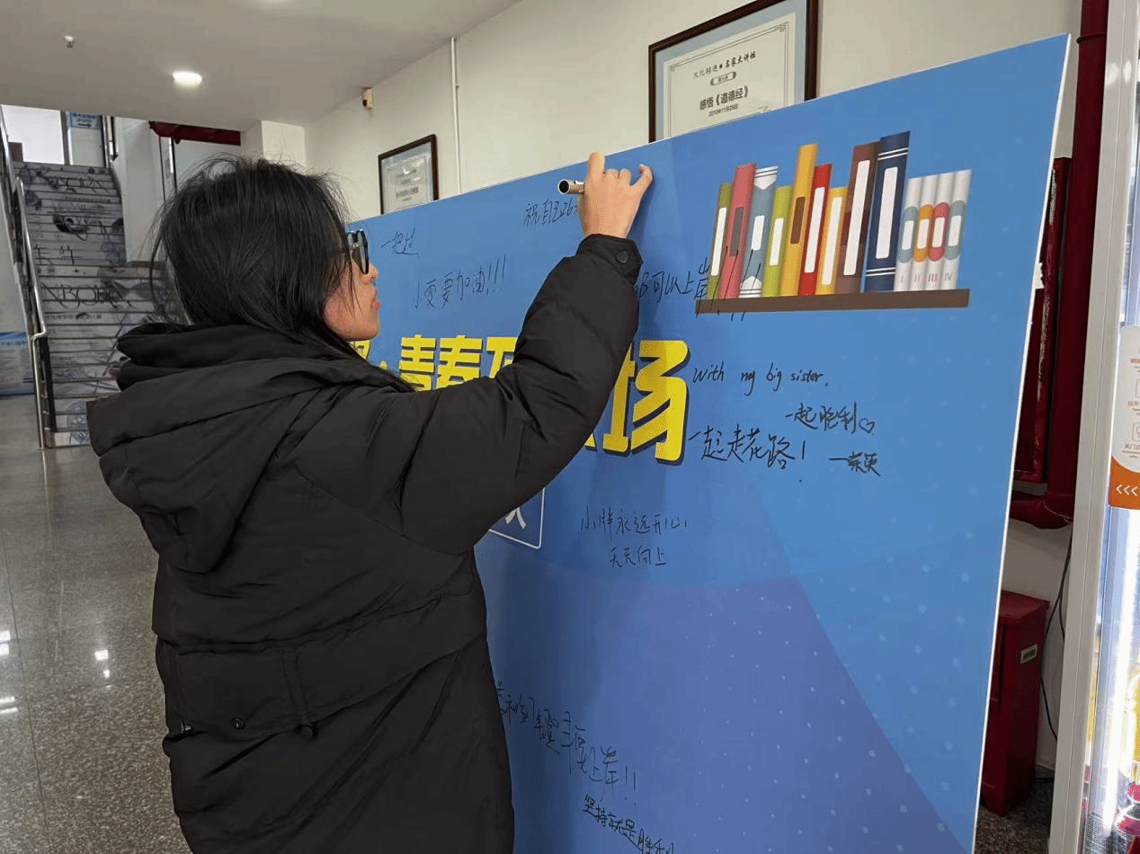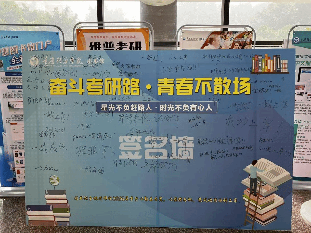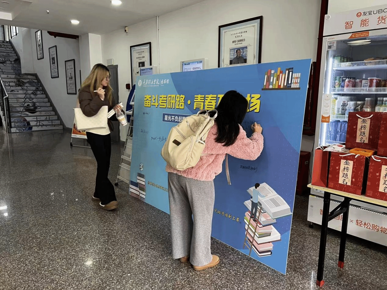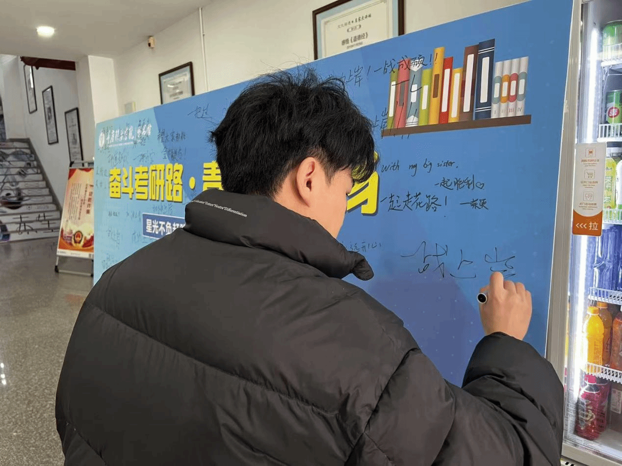 秦馆长现场发表真挚讲话,肯定同学们在图书馆从晨光熹微到灯火通明的备考时光,强调图书馆将以优化学习环境、推出暖心举措为后盾,勉励道:“大雾终会散去,梦想终将抵达,愿大家带着这份温暖全力以赴。”随后,同学们手持马克笔,在墙面上郑重写下名字与 “坚持到底,上岸必胜”等宣言,笔尖沙沙声与轻声鼓励交织。外国语学院李同学在签名下画上笑脸,为自己和研友传递温暖;通信与信息工程学院张同学与伙伴并肩落笔,坦言“看着满屏宣言,不觉独自战斗”。同学们有序领取暖心礼包,接过饱含关怀的礼物纷纷表达感动。艺术与传媒学院徐同学道:“寓意与签名氛围鼓舞人心,大雾天收礼太惊喜,暖手宝暖心,香牌安心,疲惫都散了。我也会化关怀为冲刺动力,争取一战上岸。”