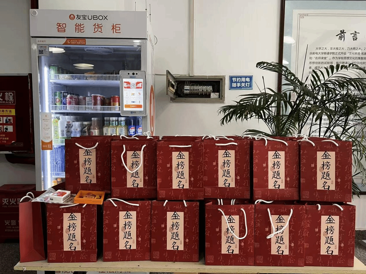 活动前,图书馆老师们将五十份礼包整齐陈列,一旁蓝色“考研加油”签名墙印着“奋斗考研路,青春不散场;星光不负赶路人,时光不负有心人”白色字样,为活动增添了浓厚的集体奋斗氛围。礼包内含“纸定上岸”定制纸巾(谐音“提笔定上岸”)、便携暖手宝、刻有“上上签”的香牌、“一举夺葵”钥匙扣(向日葵造型喻“一举夺魁”),兼具实用与励志意义。大雾并未阻挡同学们的脚步,大家有序排队,脸上洋溢着期待的笑容,让雾气氤氲的大厅充满了青春的朝气。