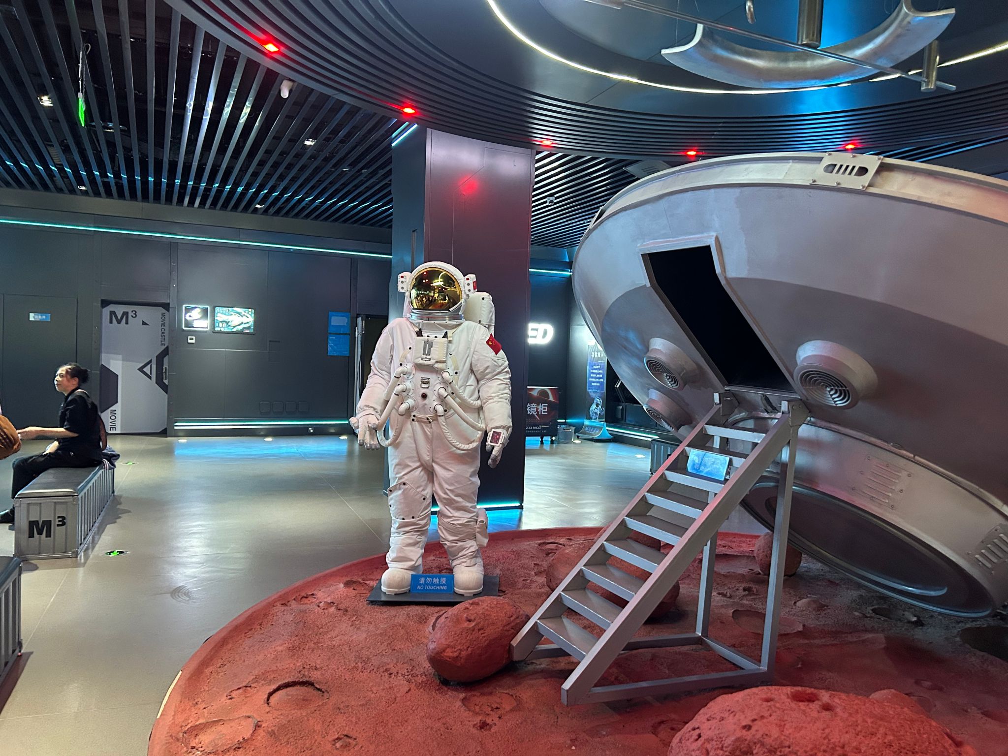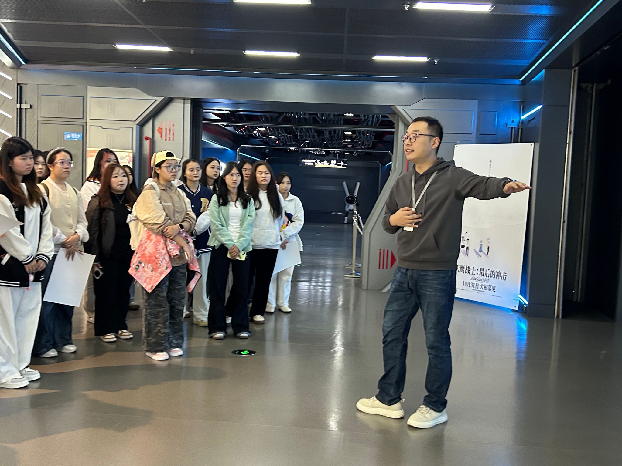 第一站调研结束,师生们有序离场后乘车前往南坪M³电影城堡,经过短暂车程与现场整备,开启第二站的调研。走进M³电影城堡充满科幻感的太空主题场景让同学们眼前一亮,宇航员航天服陈列、模拟火星地貌的装置等,让同学们沉浸式感受到电影场景营造的独特魅力。