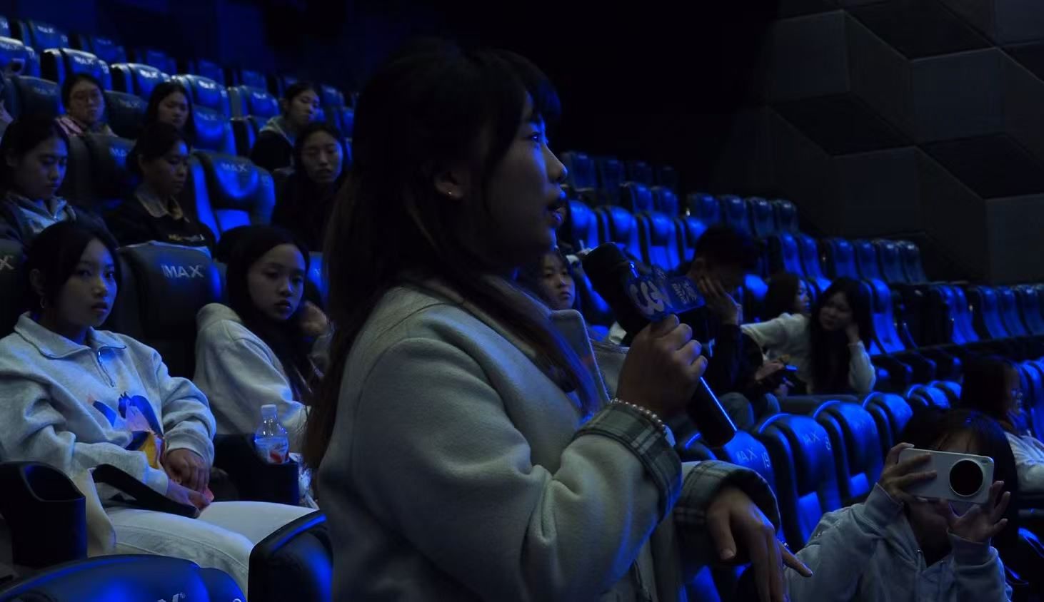 ScreenX厅作为本次调研的首个重点,其多面屏融合成像技术让不少同学直呼“大开眼界”,三位同学在分享观影感受时坦言:“第一次体验全景式画面包裹感,仿佛置身电影场景之中。”现场还收到了影城准备的惊喜小礼物。随后,IMAX厅播放的《碟中谍7》经典片段,凭借极致清晰的画质与沉浸式声场,让同学们深刻体会到“声临其境”的观影质感,进一步理解了高端放映技术对观影体验的提升作用。
