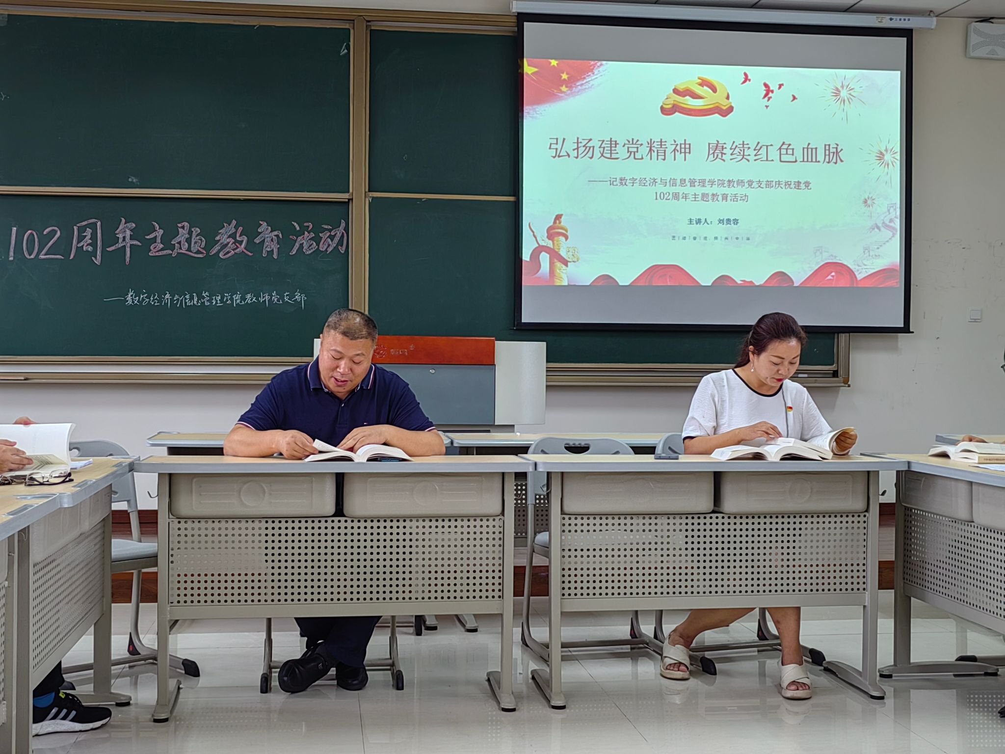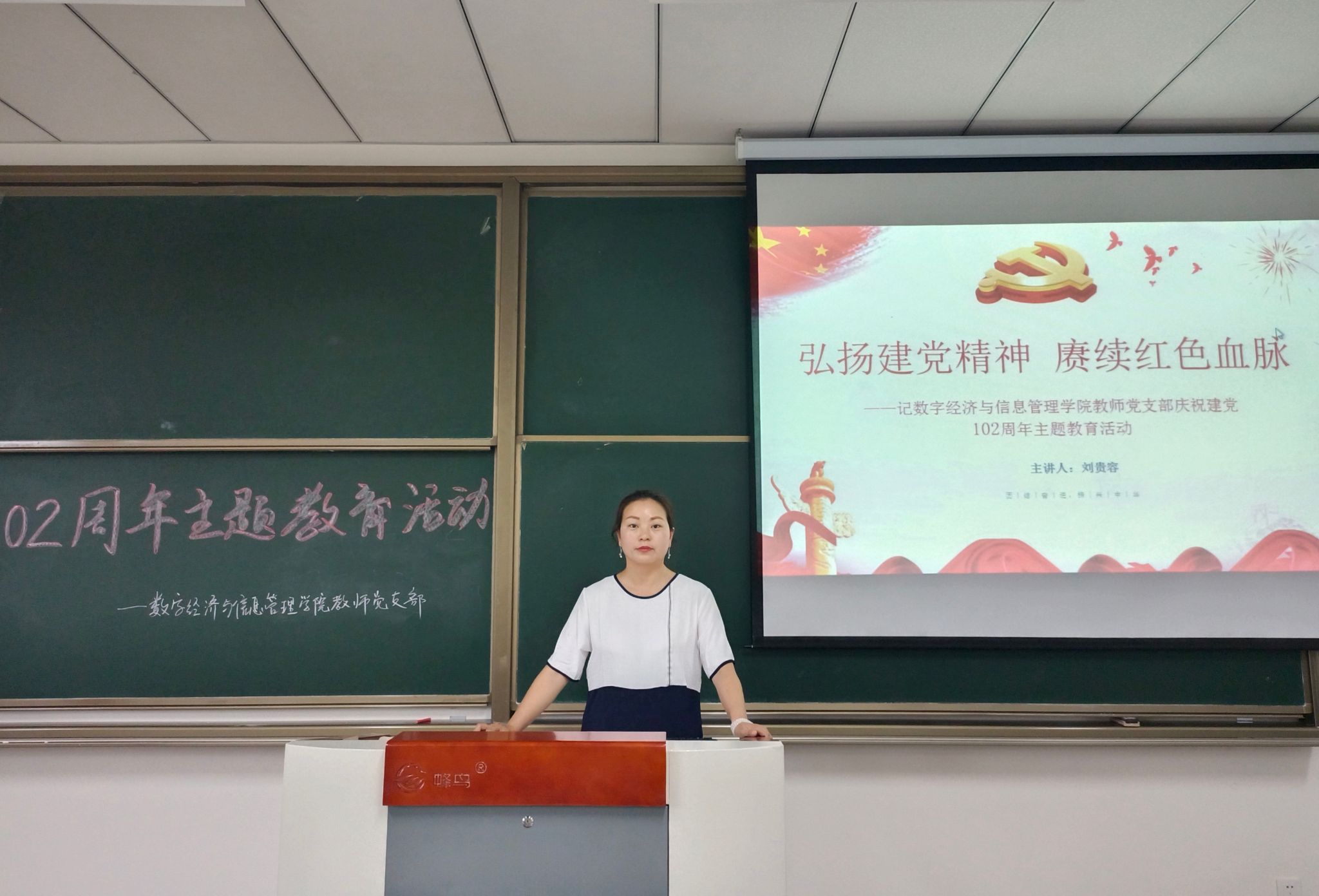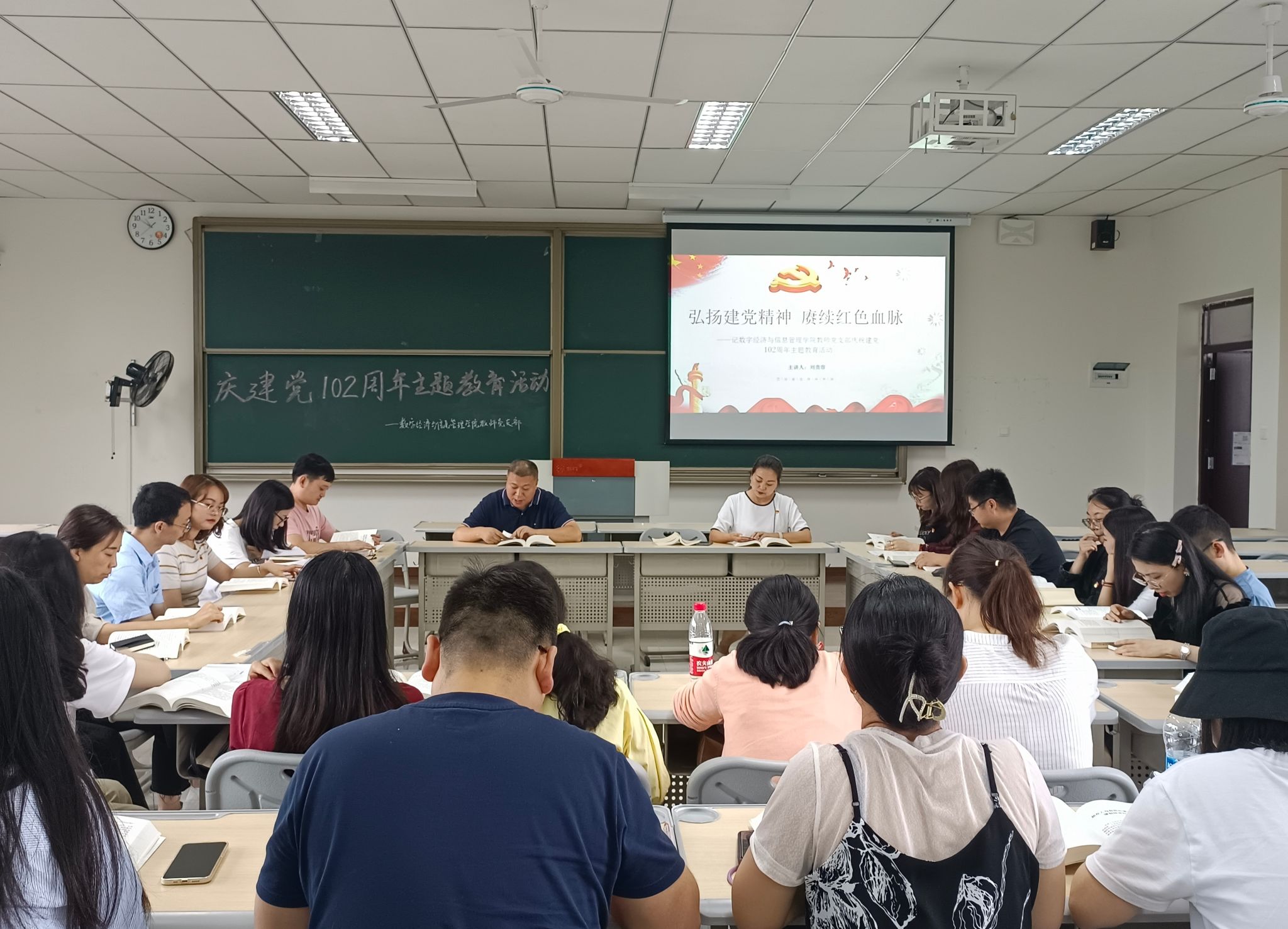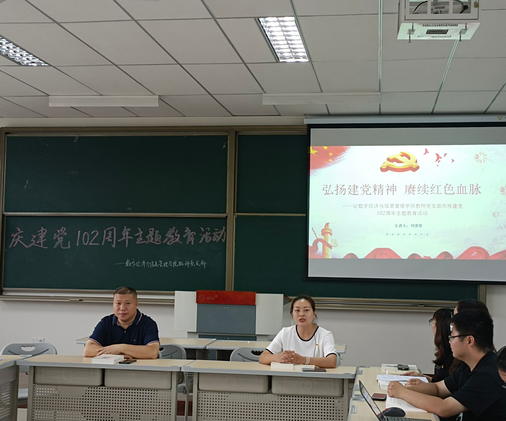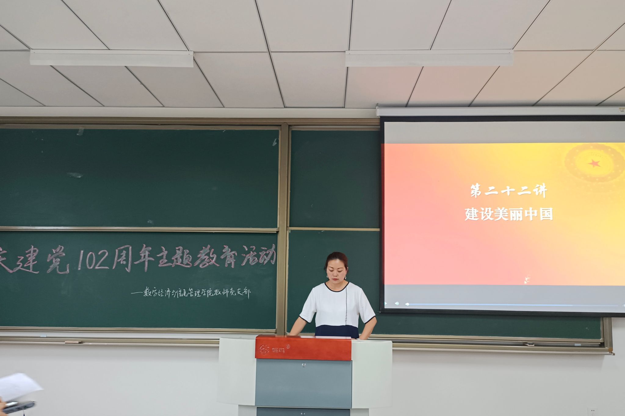 庆祝中国共产党成立102周年,抓实抓细党史学习教育和作风建设,提升教师政治意识,增强使命感和责任感,6月20日14:30,数字经济与信息管理学院党支部书记刘贵容同志以“赓续红色血脉,传承建党精神”为主题开展主题教育座谈会,带领全体党员教师学习贯彻习近平新时代中国特色社会主义思想中关于建设美丽中国有关讲话精神。本次大会由支部书记刘贵容主持,全体党员教师参与。